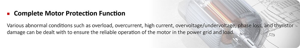 | সুরক্ষা ফাংশন | ফেজ লস সুরক্ষা, ওভারকারেন্ট সুরক্ষা, ওভারলোড সুরক্ষা, বর্তমান ভারসাম্য সুরক্ষা, ওভারহিটিং সুরক্ষা, স্টার্ট টাইমআউট সুরক্ষা, আন্ডারভোল্টেজ/ওভারভোল্টেজ সুরক্ষা, স্টার্ট ওভার ফ্রিকোয়েন্সি সুরক্ষা, উচ্চ কারেন্ট সুরক্ষা, থাইরিস্টর ব্রেকডাউন সুরক্ষা, পাওয়ার রিভার্স সিকোয়েন্স সুরক্ষা, তারের ত্রুটি সুরক্ষা ইত্যাদি। |